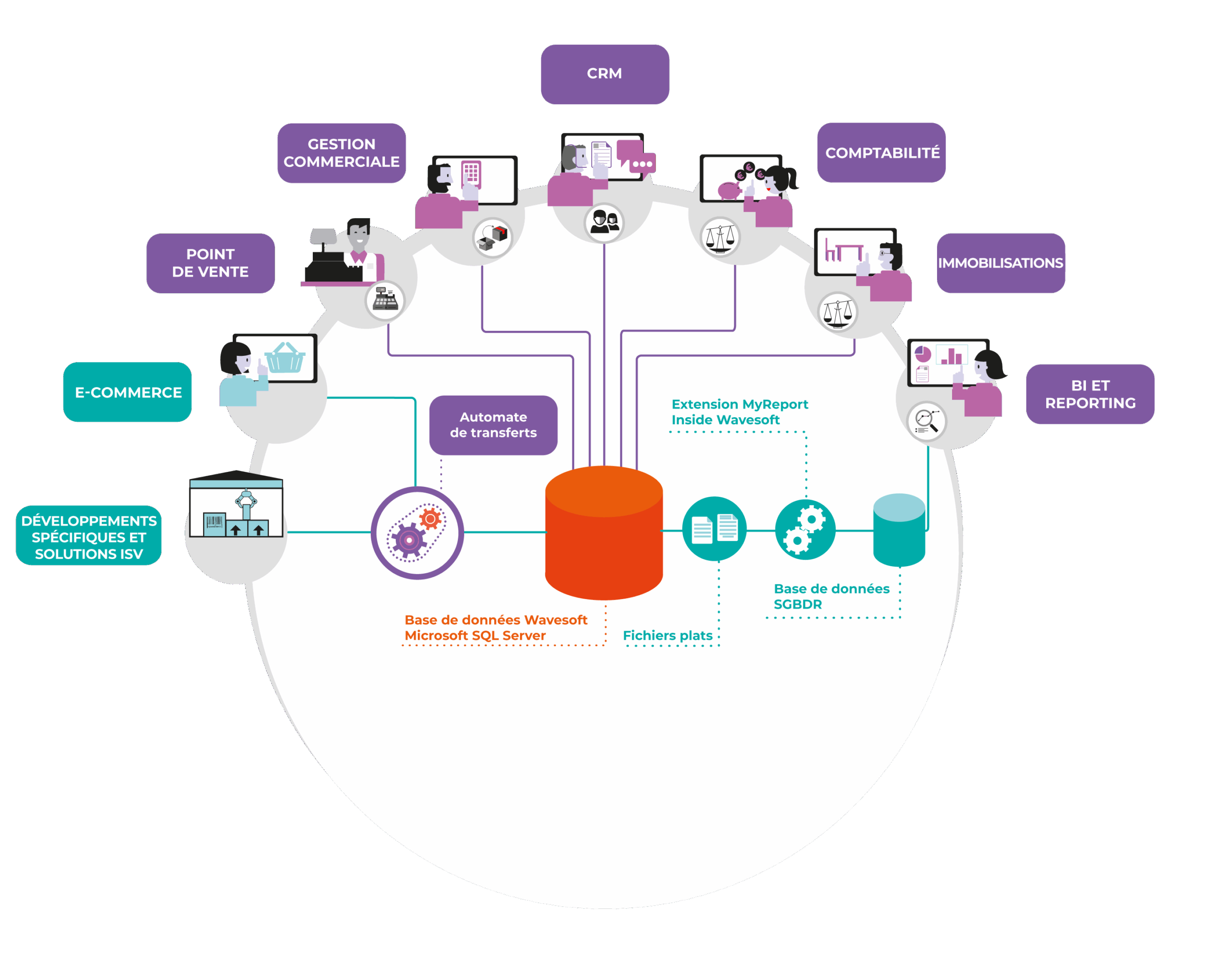 Les modules du catalogue WaveSoft couvrent les fonctions clés des entreprises : CRM, Gestion Commerciale, Comptabilité, Point de Vente, Business Intelligence, Gestion de Production, Etats financiers et Immobilisations.